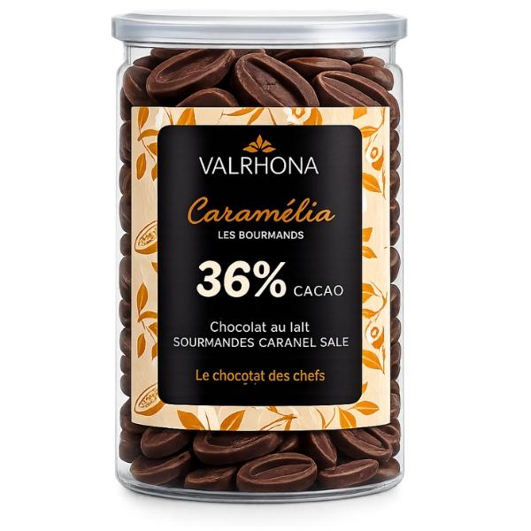 Fèves de chocolat au lait et caramel Valrhona Caramélia 36% de cacao, Création Gourmande.
