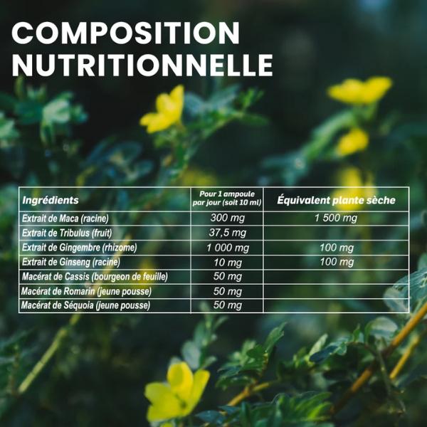 Composition : INGRÉDIENTS : eau, extrait aqueux de Gingembre (Zingiber officinale Roscoe), jus concentré de citron, extrait sec de Maca (Lepidium meyenii Walp.), macérat glycériné de bourgeon de feuille de Cassis (Ribes nigrum L.), macérat glycériné de jeune pousse de Romarin (Rosmarinus officinalis L.), macérat glycériné de jeune pousse de Séquoia (Sequoiadendron giganteum (Lindl.) J.Buchholz), arôme naturel de gingembre, extrait sec de Tribulus (Tribulus terrestris L.), extrait sec de Ginseng (Panax ginseng C.A. Mey.).