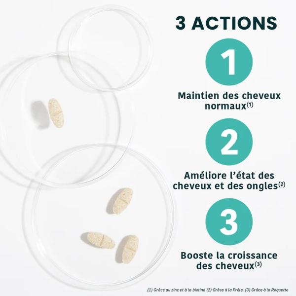 - Des Vitamines & Minéraux tels que la Vitamine B6 qui contribue à la synthèse normale de la cystéine, la Vitamine B8 (biotine), le zinc et le sélénium qui contribuent au maintien de cheveux normaux.