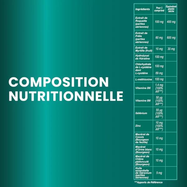 Composition : agent de charge : gomme d’acacia, L-méthionine, chlorhydrate de L-cystéine, extrait sec de Roquette (Eruca vesicaria L. Cav.), hydrolysat de kératine, gluconate de zinc, extrait sec de prêle des champs (Equisetum arvense L.), anti-agglomérants : carbonate de magnésium, phosphates de calcium, levure enrichie en sélénium, macérats glycérinés [eau, glycérine, alcool, bourgeon de feuille de Cassis (Ribes nigrum L.), bourgeon d’Orme blanc (Ulmus glabra Huds.), bourgeon de Chêne pédonculé (Quercus robur L.)], extrait sec de Myrtille (Vaccinium myrtillus L.), anti-agglomérant : sels de magnésium d’acides gras, huile essentielle de Géranium (Pelargonium graveolens L'Hér.), chlorhydrate de pyridoxine, -biotine. Plantes : origine UE et non-UE Trio de bourgeons : origine France L-cystéine et L-méthionine, Vitamines et Minéraux : origine UE et non-UE